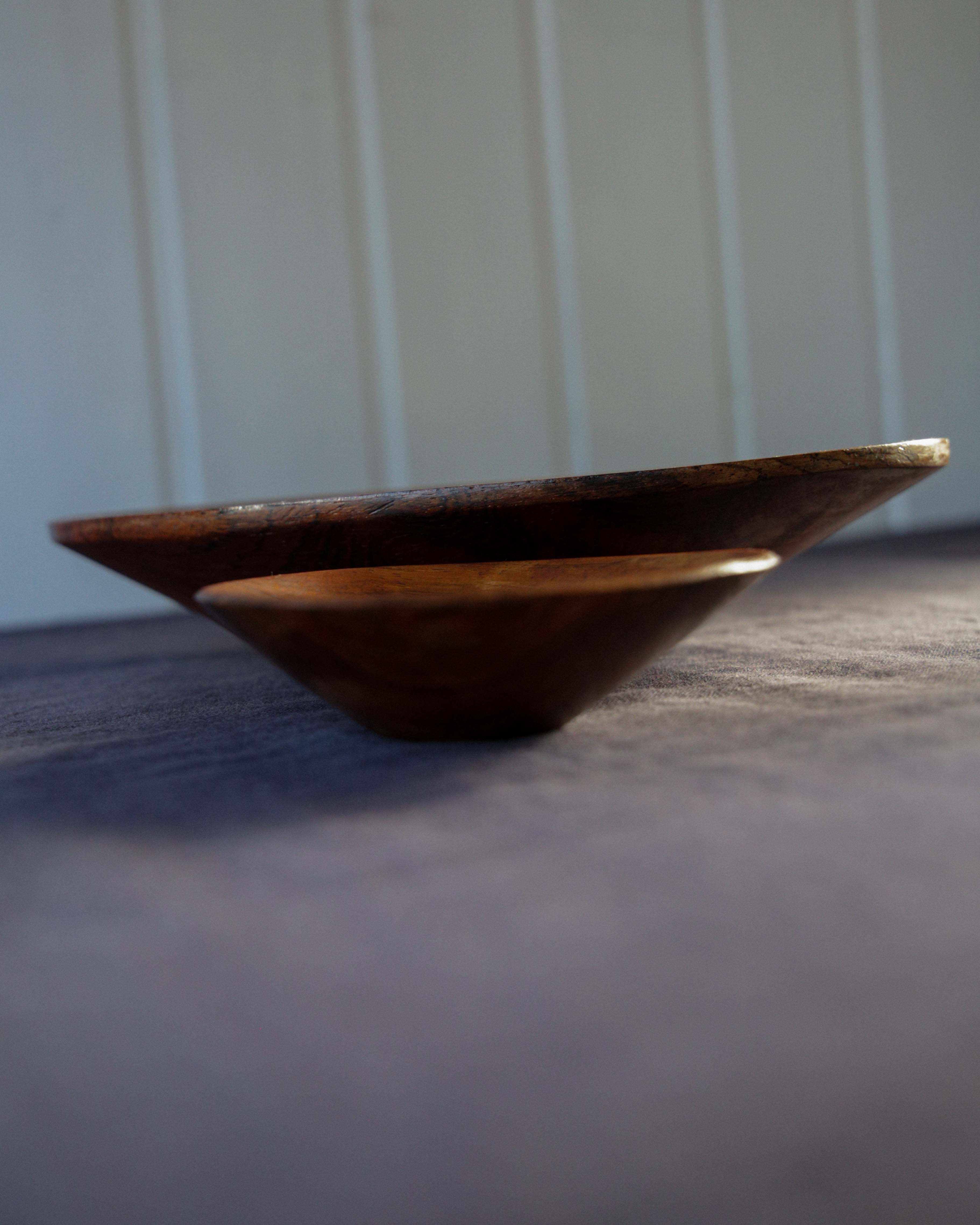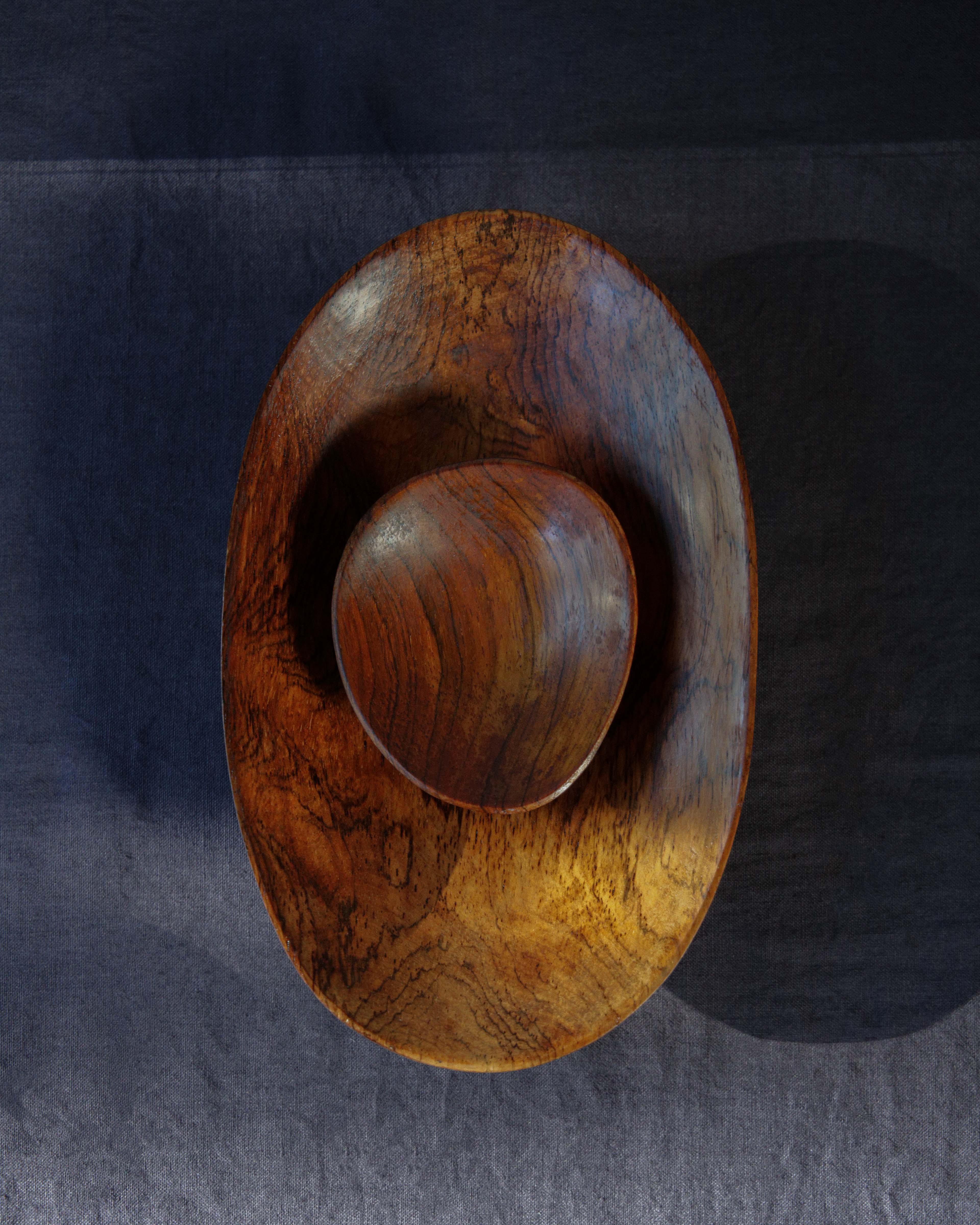 With their smooth, organic shapes and rich wood grain, these bowls feel like small sculptures as much as tableware. Hand-carved in the 1970s, they celebrate natural asymmetry—each curve and line shaped by hand, not machine. A warm, tactile set that brings an earthy charm to any table.