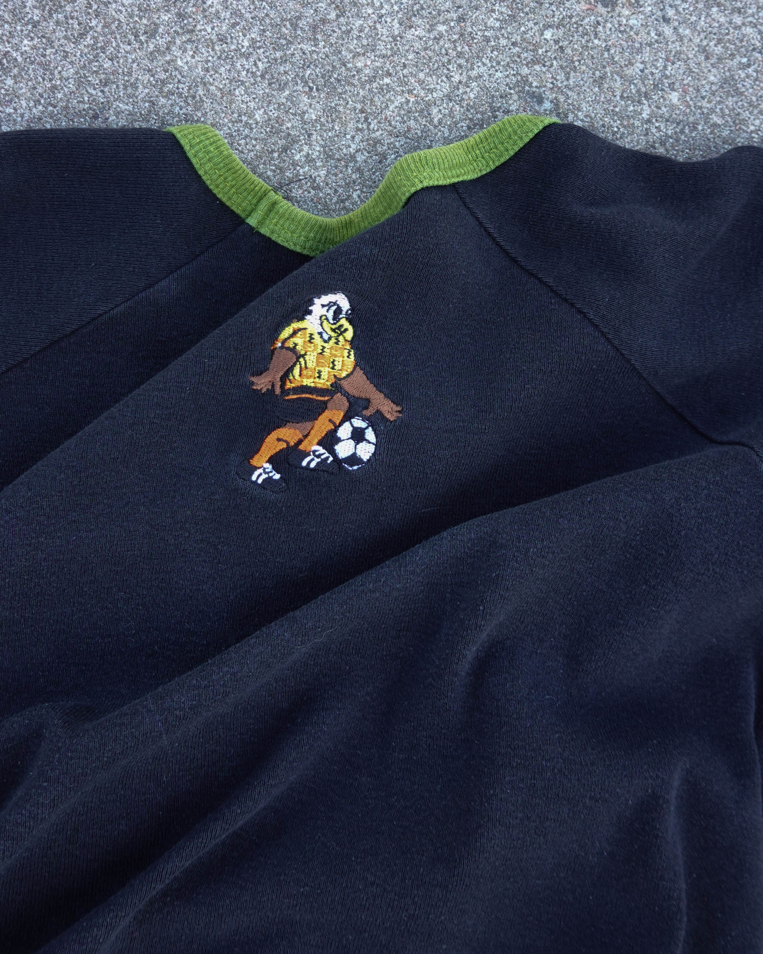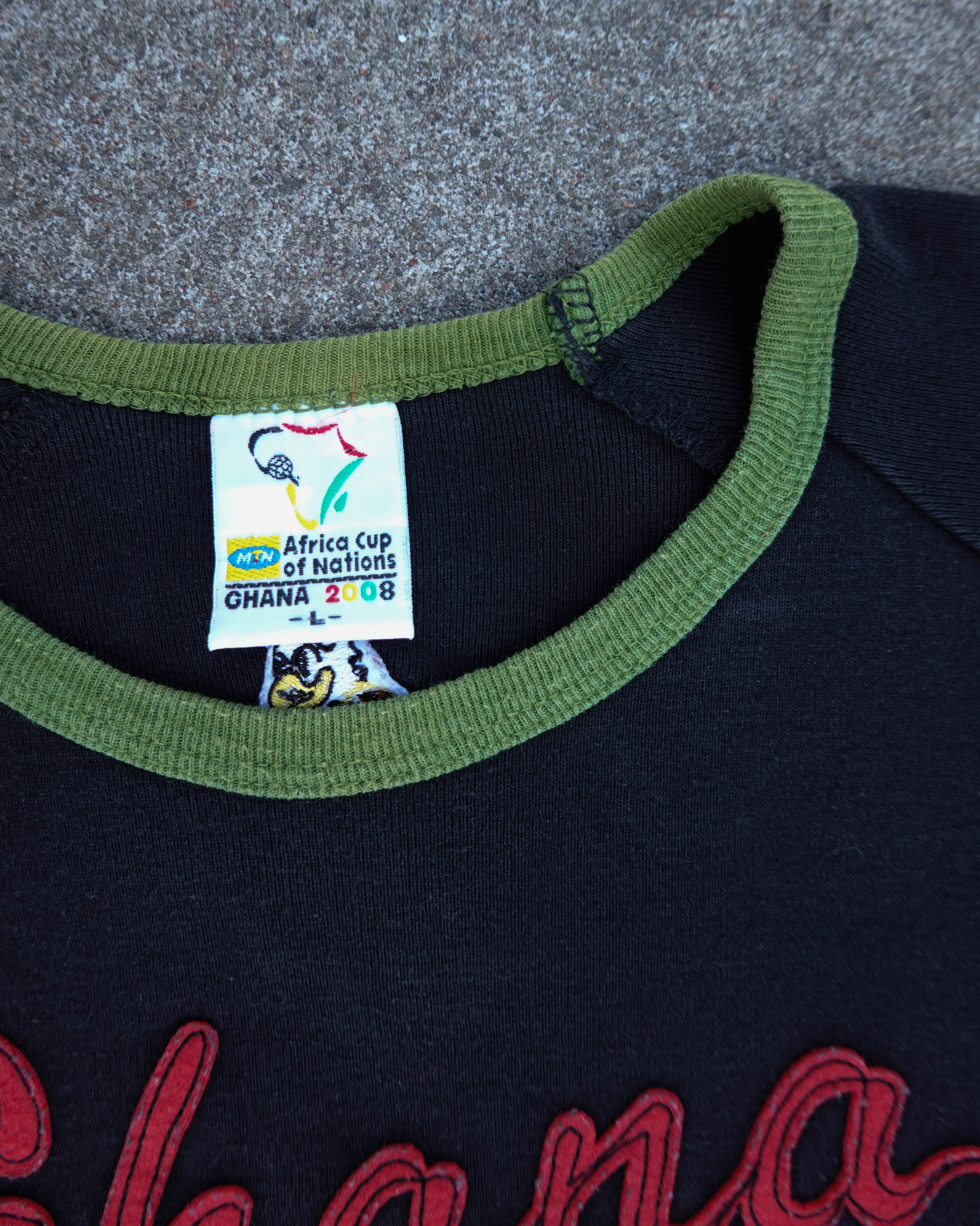 A bold souvenir from the 2008 Africa Cup of Nations, hosted in Ghana. This vintage tee features thick appliqué lettering, sleeve stripes in national colors, and the Ghanaian flag — a wearable celebration of football history and West African pride.