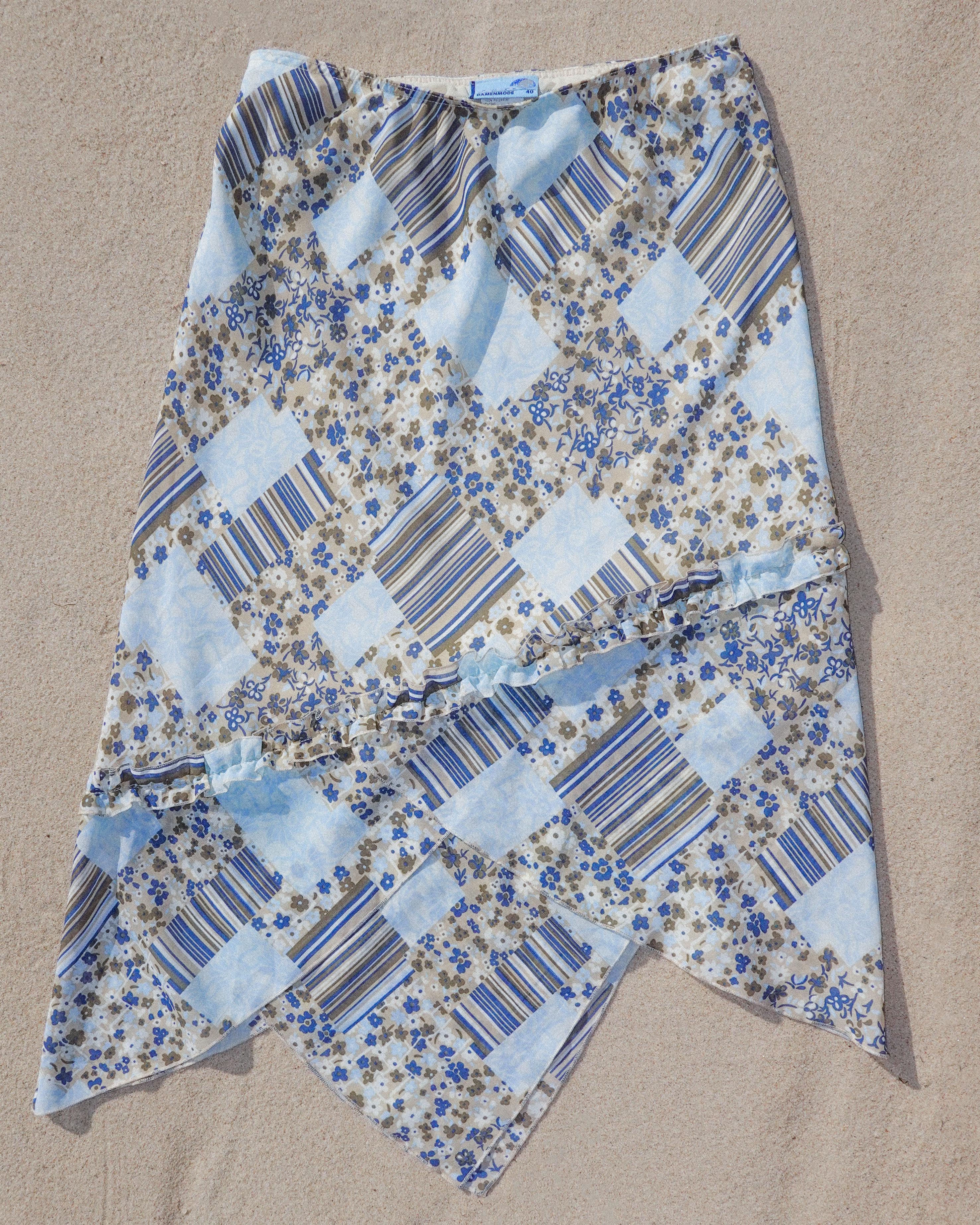 A light and breezy piece with a playful mix of florals and stripes in soft shades of beige, blue, and brown. The asymmetric hem and wrap-like construction add movement and charm.