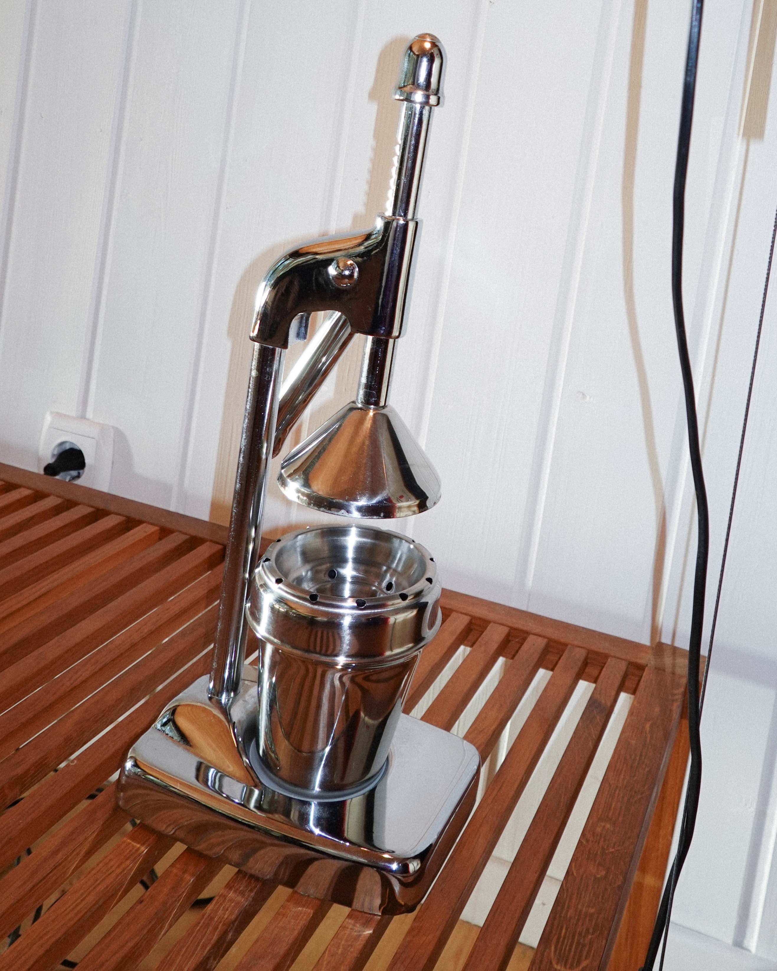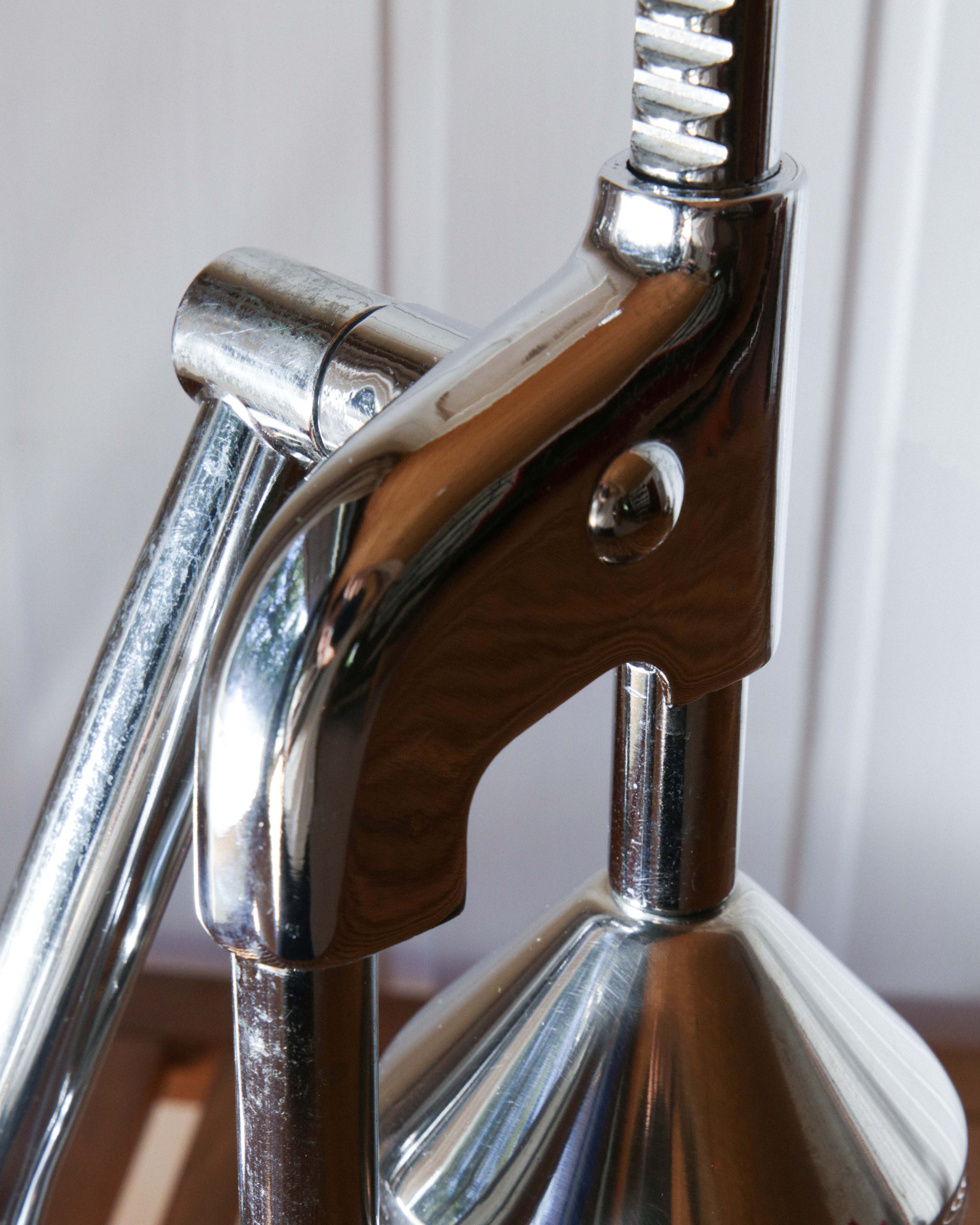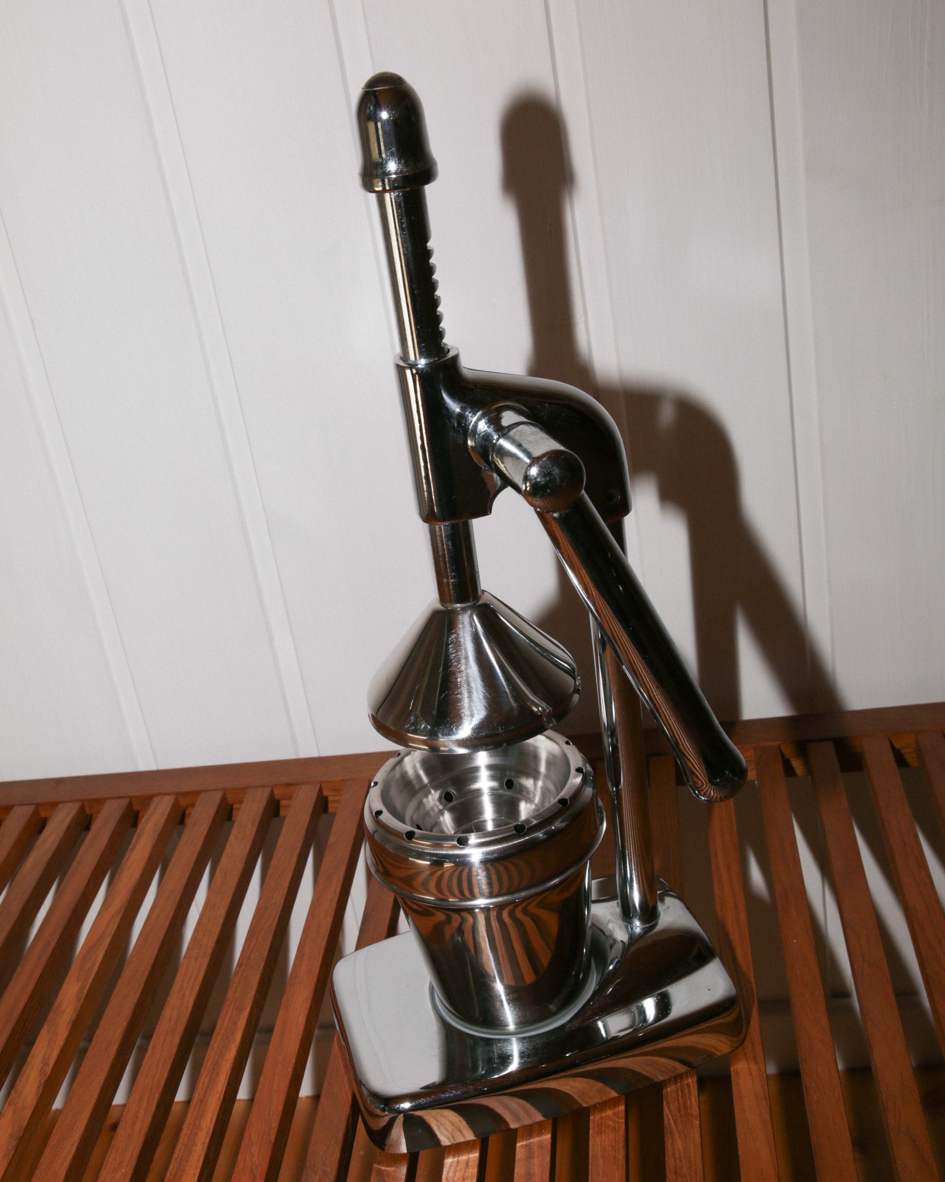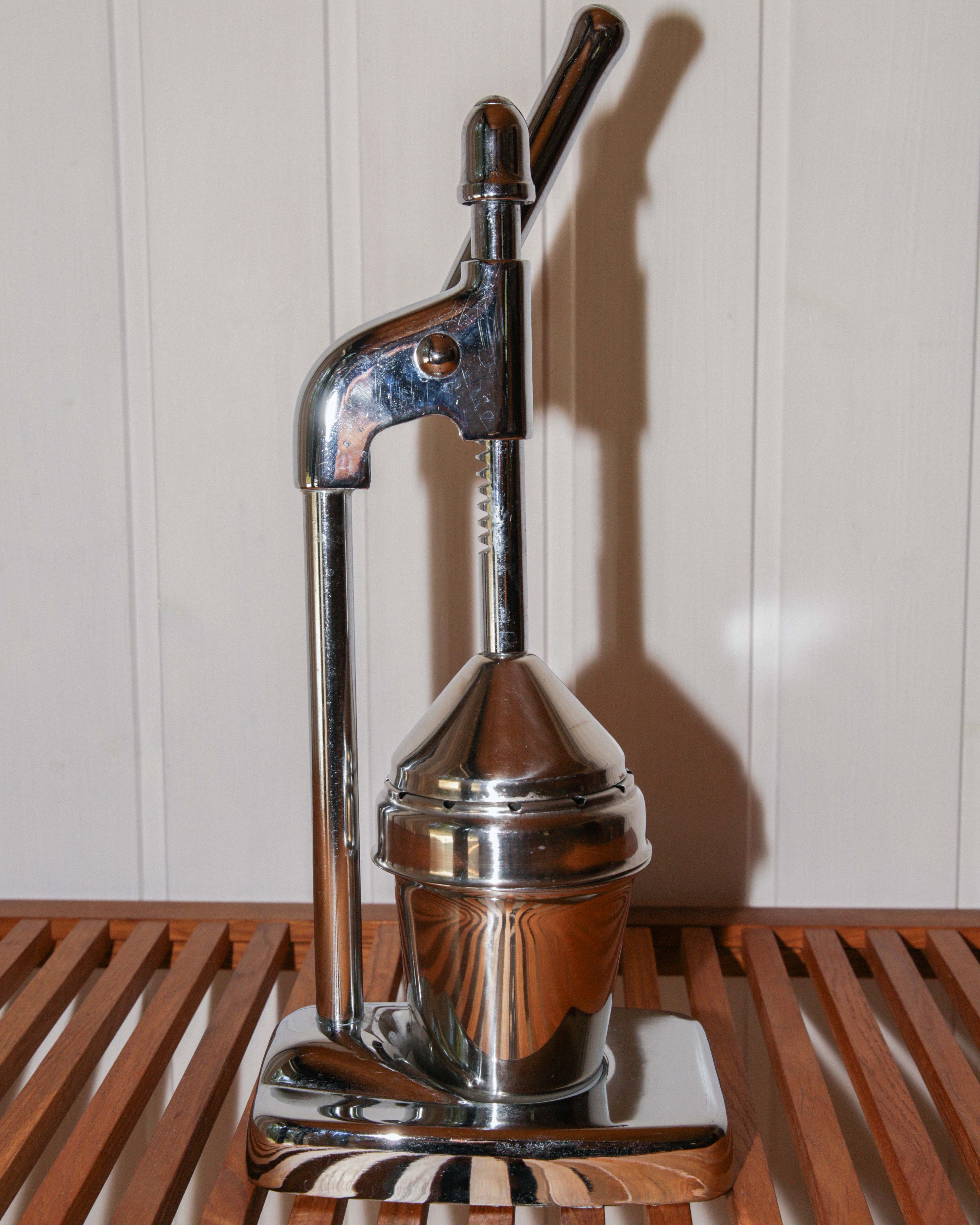 A bold piece of kitchen design from the 1970s, this chrome citrus press combines industrial strength with sculptural elegance. Its polished surface reflects light like a mirror, while the lever-and-cone construction makes squeezing fruit feel both effortless and satisfying. More than just a practical tool, it’s a statement object that brings a touch of retro bar culture straight into the kitchen.Era: 1970’s