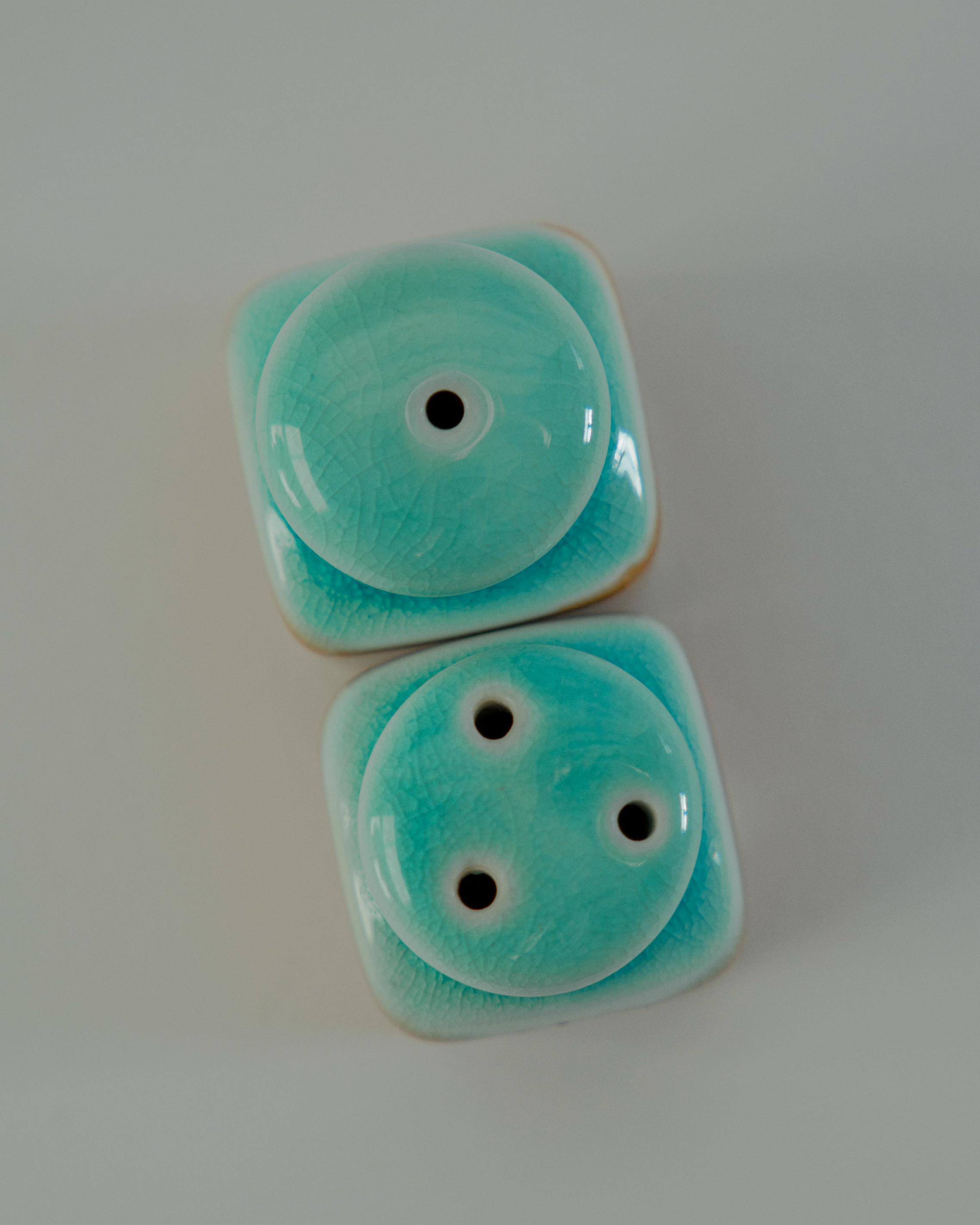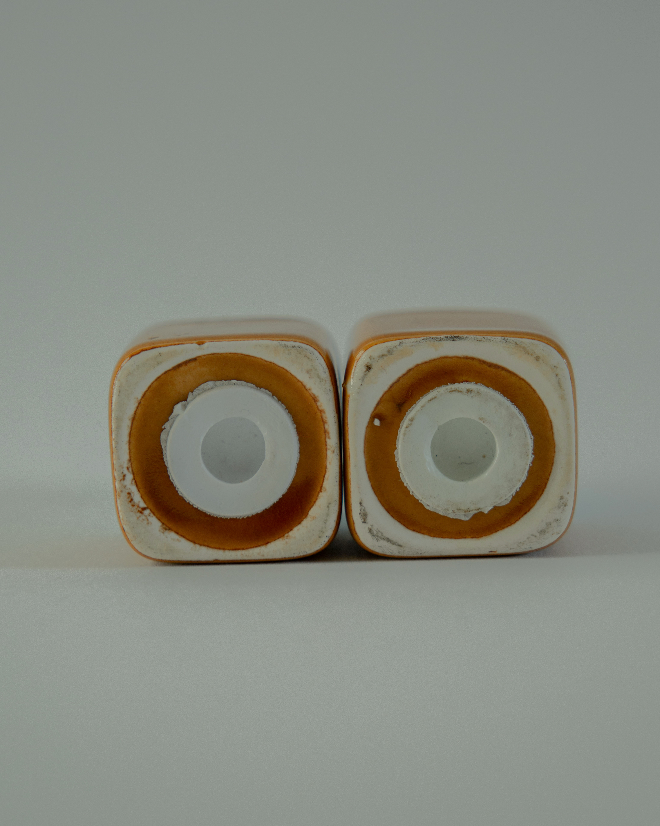 Small ceramic shakers with a glossy turquoise glaze on top and warm ochre base. The rounded tops and square bodies give them a playful, compact look.Material: Ceramic