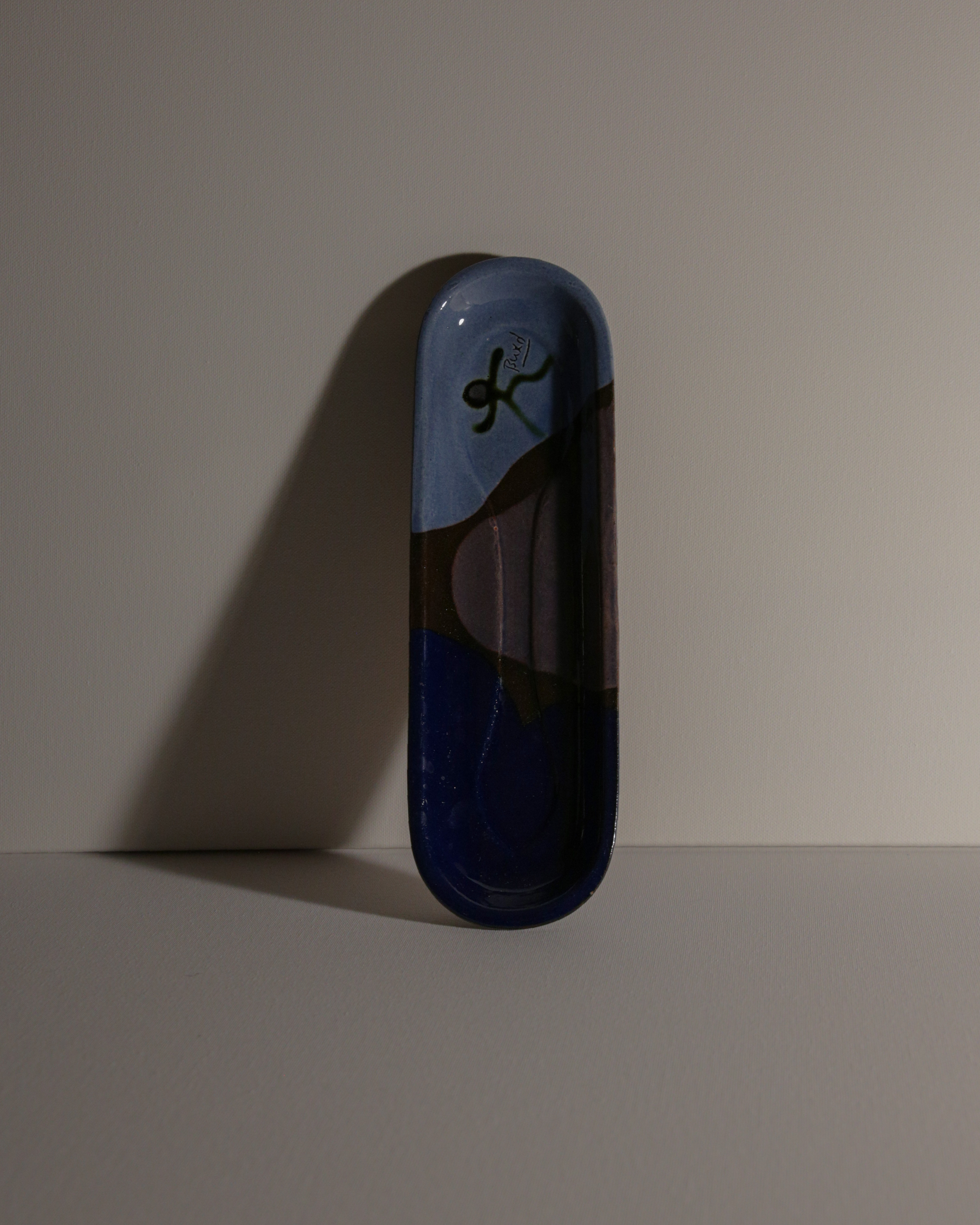 This handcrafted ceramic spoon rest features a sleek elongated design with a captivating blend of deep midnight blue and subtle earthy hues. Its smooth, glazed surface offers both practicality and elegance, making it a striking addition to your kitchen decor.Material: Ceramic