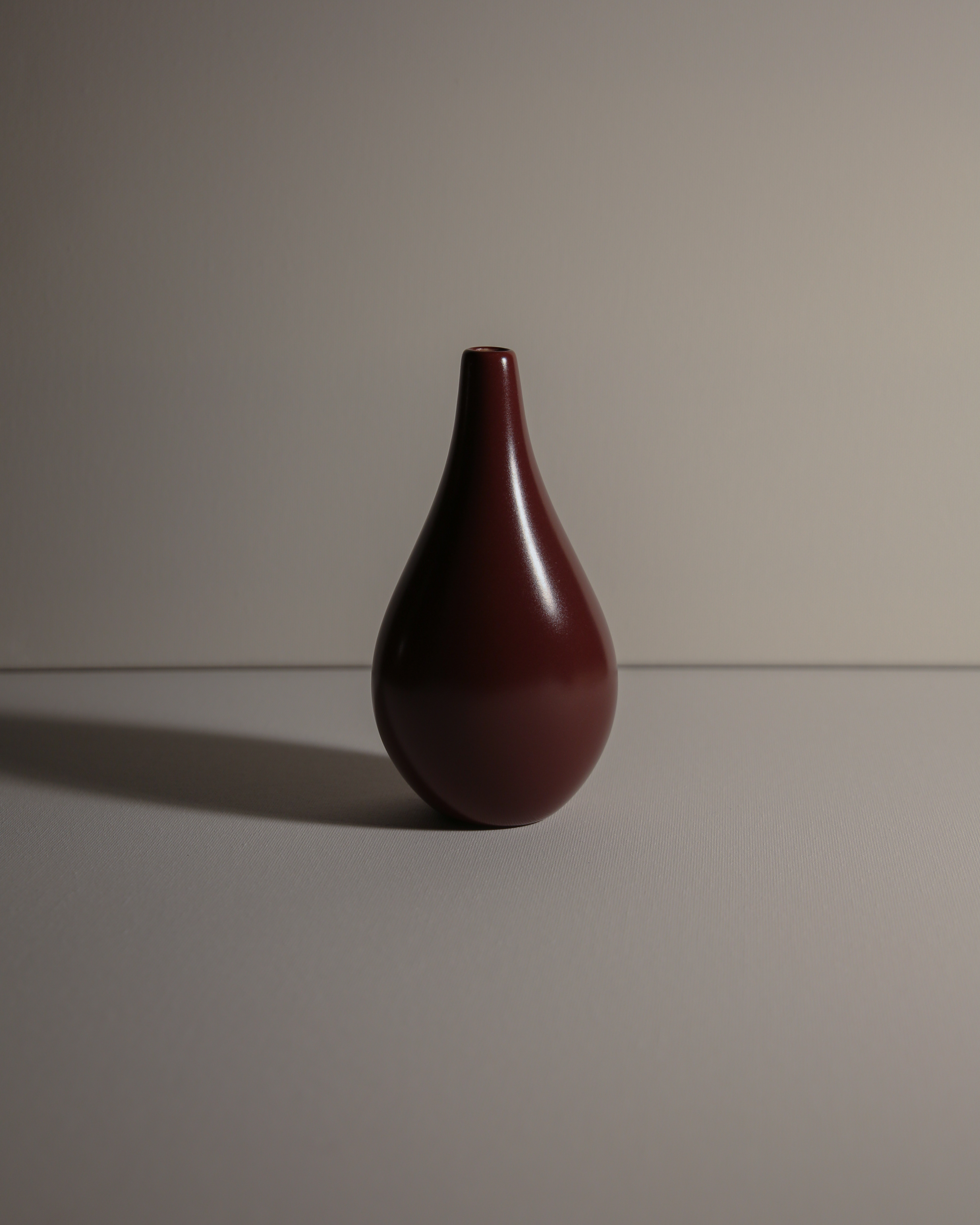 A beautifully crafted pear-shaped ceramic vase with a rich, deep burgundy finish. Its smooth curves and glossy surface make it a striking choice for showcasing a single flower or as a standalone accent piece.