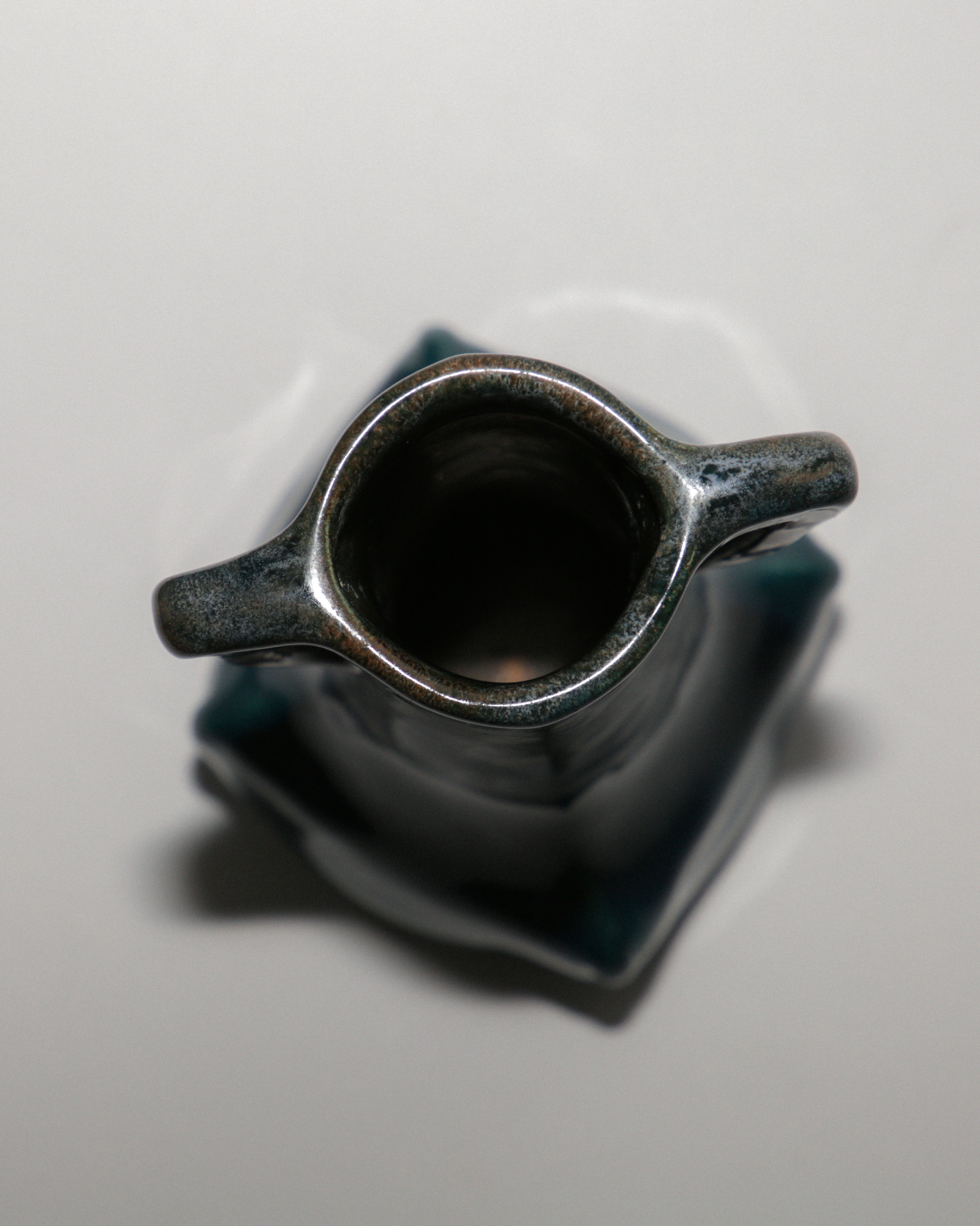 Studio pottery vase with sculptural handles and a rich, flowing glaze in deep teal and smoky grey. The organic, hand-built form sits somewhere between brutalist geometry and natural asymmetry, giving it a tactile, almost creature-like presence.Marked on the base with a crest enclosing the initials “A.K.” — possibly of Central or Eastern European origin. Craquelure in the glaze suggests age.