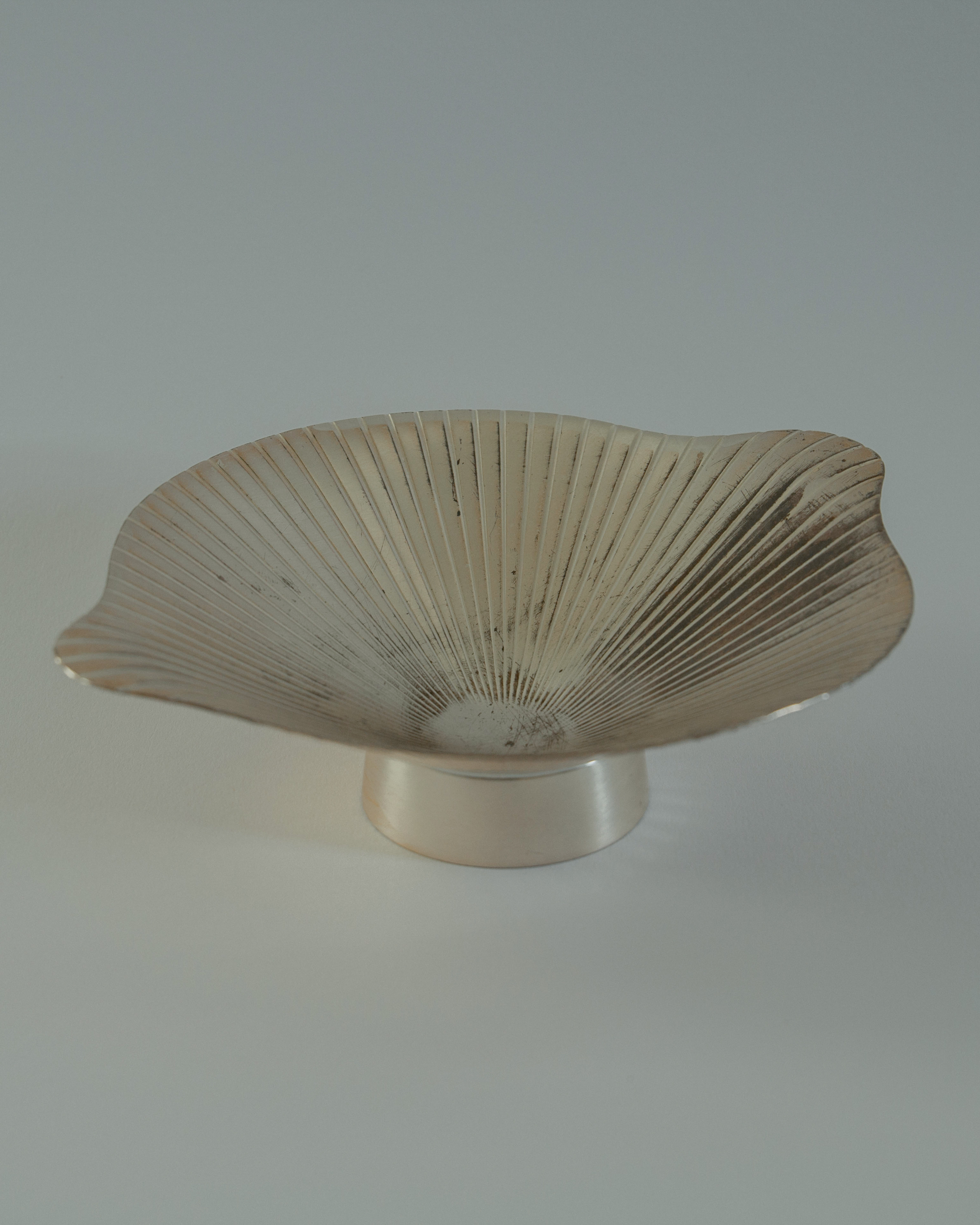 Shallow dish made of silver plated metal, with a ribbed surface and gently wavy rim. Shows natural signs of age and wear.