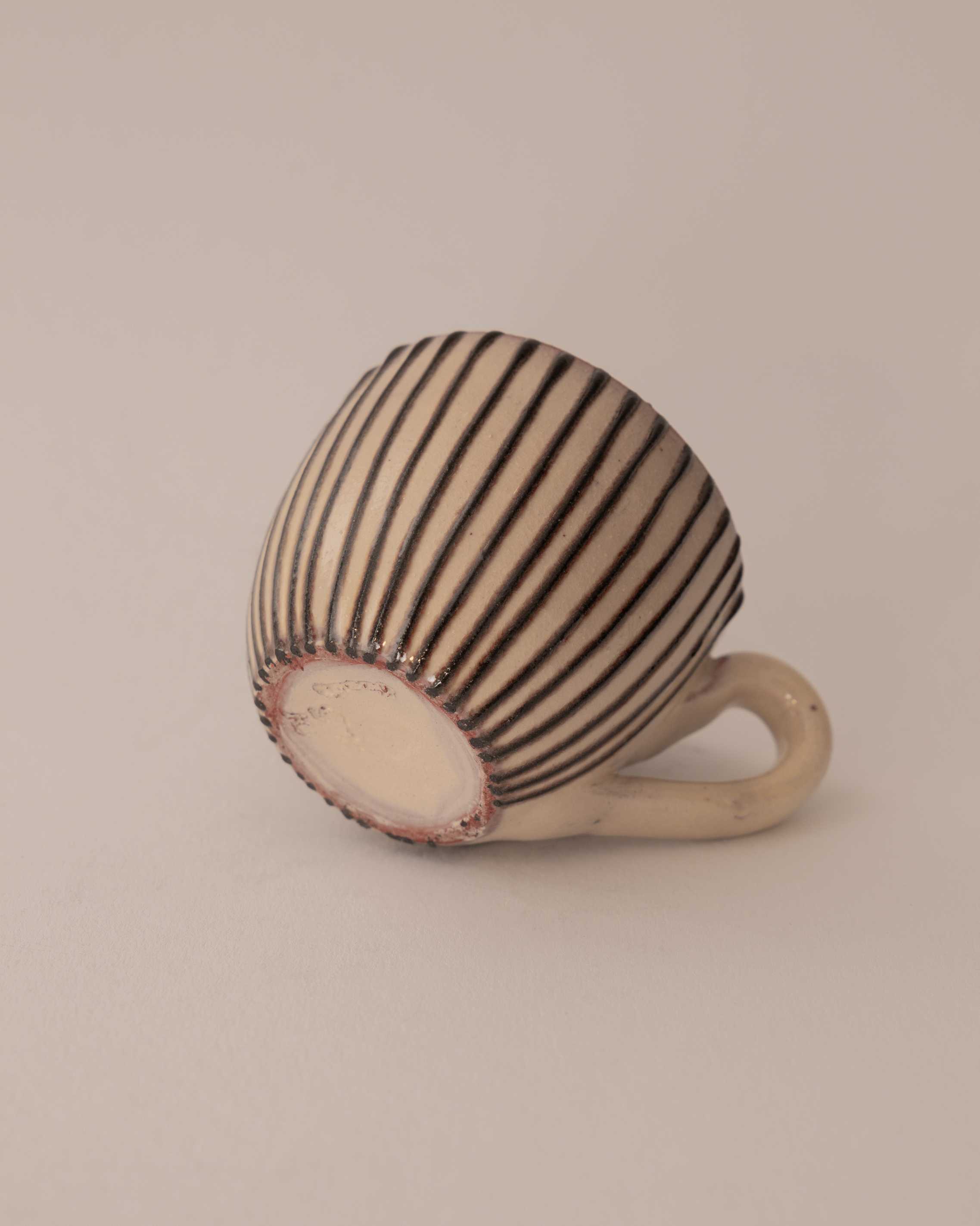 Handmade ceramic cup with a striped exterior and a deep reddish-brown glazed interior. The slightly irregular shape highlights its handcrafted nature.